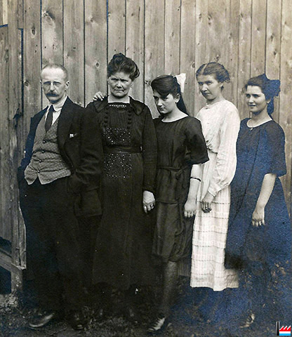 Gaspard Huss (32 ans) et sa mère Catherine Félicie Huss - Voelker (55 ans), Félicie Ludig, Jeanne Aschman (33 ans) - soeur de Camille Aschman - Huss, Léonie Voelker - 18.7.1920 (Collection famille Aschman-Bodson)