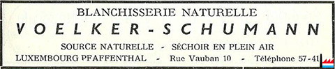 | 30.10.1945 | D’Wäscherei Voelker-Schumann, Pâfendal délt hirer werter Kondschaft mat, dat se eröm an der Lâg ass, we‘ fre’er d’Wäsch am Haus ofzehuelen. Tel. 57 - 41 oder Postkârt genügt. Veuve Voelker-Schumann (LW: N° 6376 - 30.10.1945) |
