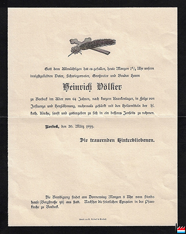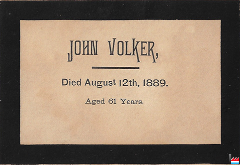 ![]() JOHN VOLKER Died August 12th, 1889. Aged 61 Years. (Collection Aschman-Bodson, Luxembourg) Décès à Monongahela, Pennsylvanie (USA) de John (Johan) Francis (Franz) Volker (Voelker) (* 2.8.1828 à Essen), époux de Johanna Catherina Elisabeth Ebbinghaus (* 4.12.1833 à Lünen, Westphalie ; † vers 1904 à Monongahela), postérité, et frère de Léonard Guillaume Voelker-Stadtfeld. |
