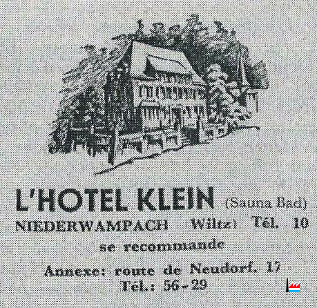 | 8.1953 | VILLÉGIATURE - Hôtel Klein, Nlederwampach bei Wiltz. Kegelbahn, Weekend. Kur, Sauna - Bad. Tel. 10. Festspielbesucher, benutzet die Gelegenheit ! (LW: 7.8.1953) |