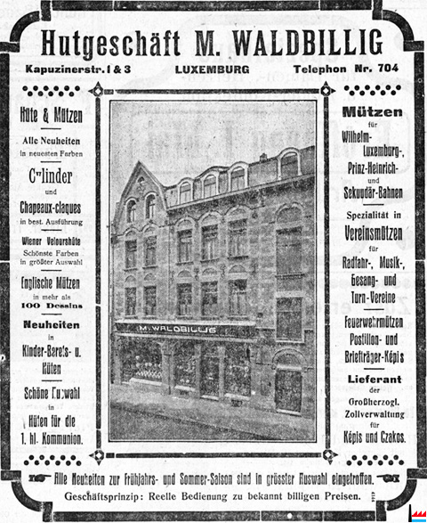 | <=1904 | Waldbillig Wwe, Huthandlung Waldbillig Jean 3 rue des Capucins, Luxembourg |