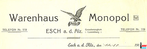 ![]() Warenhaus Monopol, Esch/Alzette (Extrait d'une facture de 14.10.1916; collection ANLux) |