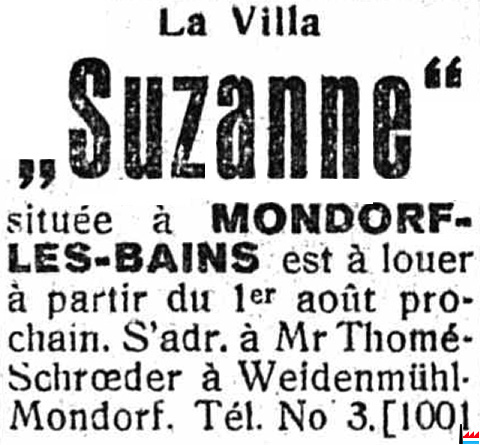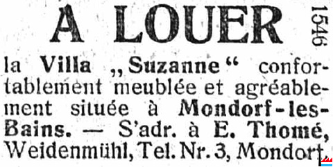 | 1.8.1924 | Villa Suzanne, Mondorf-les-Bains à louer: S'adresser à Thomé-Schroeder, Weidenmühl, Tel. 3, Mondorf (LW: 19.7.1924) |
