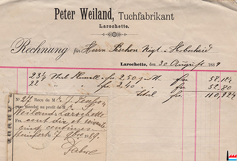 Weiland Peter, Larochette, Tuchfabrikant (Rechnung 1889; Collection: industrie.lu)