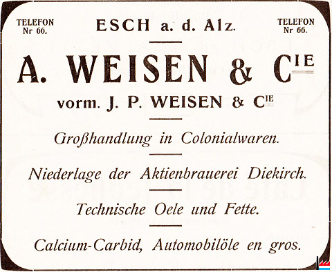 | 1911 | Jean-Pierre Weisen & Cie., Esch-s.-Alz. (Inscription au registre aux firmes N° 81 - Du 21 juin 1911) |