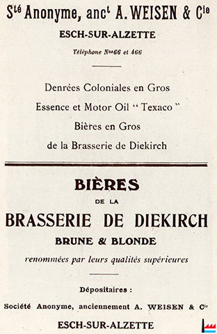 | 1924 | Durch Beschluß der Generalversammlung der Gesellschaft .Société anonyme, anciennement A. Weisen und Cie., denrées coloniales en gros", ist das Gesellschaftskapital von 750.000 Franken auf eine Million Franken erhöht worden. Die 250 Aktien zu je 1000 Franken wurden folgendermaßen eingezahlt: J. P. Birnbaum 40, Frau Fr. Gleis 40, Frau Henri Schuler 10, Frau Nicolas Sinner 30, Louis Peters 20, Joseph Dondelinger 15, Emile Schwall 15, Arthur Sinner 18, Tony Schmit-Reding 17, Emil Reding 10, Ch. Krombach 6, Frau Eug. Weisen 23. (OMZ: 31.1.1924) |
