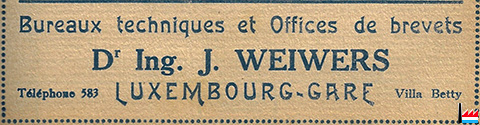 | 1917 | ![]() Bureaux techniques et Offices de brevets Dr Ing. J. WEIWERS - Luxembourg-Gare - Villa Betty, dans Almanach National Luxembourgeois - Grand Almanach Babert, 1917, p.79 . Collection Ph. Aschman |