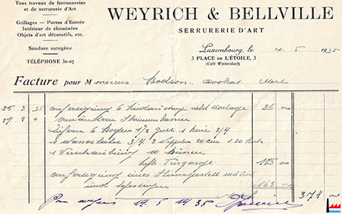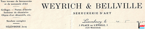 Serrurerie - ferronnerie d'Art Mathias BELLEVIILE LUXEMBOURG, place de l'Étoile TÉLÉPHONE : 255 58 recommande son travail et ses fournitures impeccables. (d’Lëtzebuerger Land: 11.4.1958) |