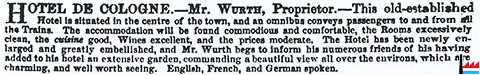 | 1853 | ![]() Hotel de Cologne. - Mr. Wurth, Proprietor. - … - Advertisement Luxembourg (Bradshaw’s illustrated hand-book to Switzerland and the Tyrol with beautiful clear steel engraved map of the country, and plans of the town, &., 1853) |