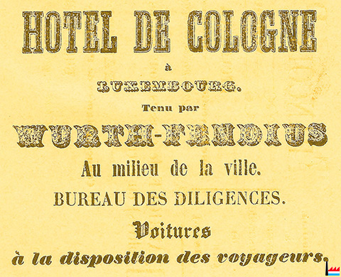 | 1885 | ![]() HOTEL DE COLOGNE Hôtel le plus ancien et le plus renommé de la ville Fondé en 1700 Würth-Fendius, propriétaire. (Le Luxembourg pittoresque. - Guide du tourisme. - Esquisse par M.-A. Perk, - 1885 – Imprimerie L. Schamburger. - Collection B.N.L.) |