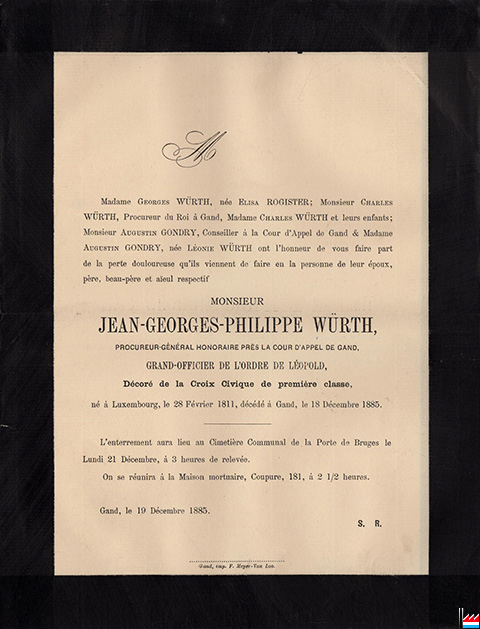 Faire-part du décès de Jean-Georges-Philippe Würth - Rogister (* 28.2.1811 à Luxembourg, + 18.12.1885 à Gand; procureur-général honoraire près de la Cour d'appel à Gand (Collection industrie.lu)