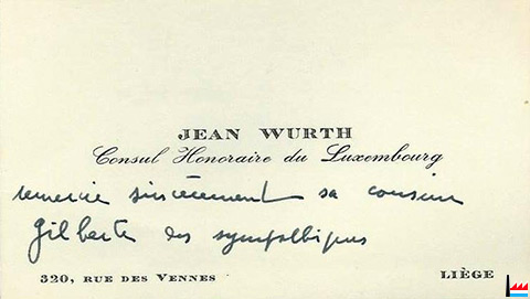 15.9.1953 - Jean WURTH - Consul Honoraire du Luxembourg remercie sincèrement sa cousine Gilberte des sympathiques félicitations qu’elle lui a adressées à l’occasion de sa nomination aux fonctions de consul. - 15.9.1953 - 320, rue des Vennes, Liège. - Carte de visite - Collection famille Aschman-Bodson
