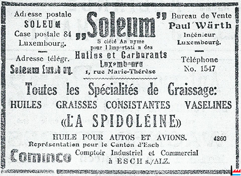 Soleum - Toutes les spécialités de craissage: huiles, graisses, consistantes, vaselines « LA SPIDOLÉINE» - 1, rue Marie-Thérèse - Bureau de Vente Paul Würth, ingénieur, Luxembourg. - Représentation pour le canton d'Esch: Cominco - Comptoir Industriel et Commercial à Esch s. /Alz.