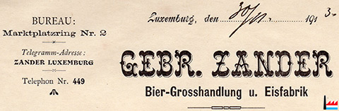 | 1910 | Zander frères, Luxembourg 2, boulevard de la Foire Bières en gros et exploitation d'une glacière. Associés: 1° Joseph Zander et 2° Albert Zander, Luxembourg. Société en nom collectif, constituée par acte du 28 juin 1910 ; les deux associes représentent chacun séparément la société et ont chacun la signature sociale. (Inscription au registre aux firmes N° 101 - Du 30 juin 1910) |