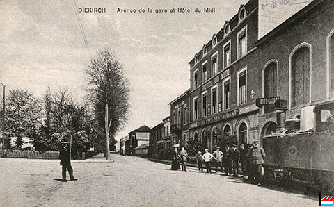 Diekirch - Avenue de la gare - L'Hôtel du Midi - Locomotive à vapeur à voie étroite N° 5 (date écrite sur carte: 18.7.1922) (Carte postale: Emile Zenner, éditeur, Diekirch M 162 20; collection: industrie.lu)