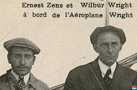 | 1908 | Aviation - Nos compatriotes à l'étranger. - L 'Indépendance Luxembourgeoise, dans son numéro d’hier, en relatant le dernier exploit de Wilbur Wright au Mans, le faisant recordman du monde, en battant de plus de 16 minutes le temps de son frère Orville, avait annoncé la présence, au camp d’Auvours, de MM. Paul et Ernest Zens, fils de notre ancien compatriote, comme officiels de l’Aéro Club. Quelques uns de nos confrères parisiens ont annoncé que Wilbur Wright avait décidé de ne plus prendre de passagers à son bord, trop ému qu’il était par la mort du lieutenant Selfridge. Cette information est absolument erronée. Wilbur Wright qui pilota déjà M Ernest Zens, le seul Européen qui monta son «oiseau-volant», (L'Indépendance Luxembourgeoise avait reproduit la semaine passée les impressions de M. Ernest Zens lors de ce vol), a l’intention d'initier prochainement MM. Paul Zens et Paul Tissandier au métier d’oiseau. (LIL: 24.9.1908) |