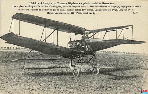 | 7.1908 | ![]() L'Aéroplane des frères Zens Ernest + Zens Paul à Gonesse - 7.1908 (Carte postale: Collection: industrie.lu) Biplan Zens avec moteur Antoinette de 40 ch |