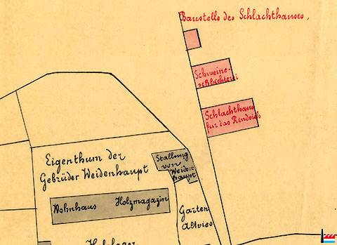 Kalköfen und Ziegelei von Herrn Altvies, Wohnhaus, Eigentum der Gebrüder Weidenhaupt, Schlachthaus (Baustelle)