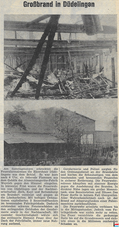 | 25.5.1963 | ![]() Großbrand in der Aluminiumgeräte-Fabrik WEYRICH, Düdelingen (LW: 27.5.1963 p.6; Scan: Fernand Toussaint) |