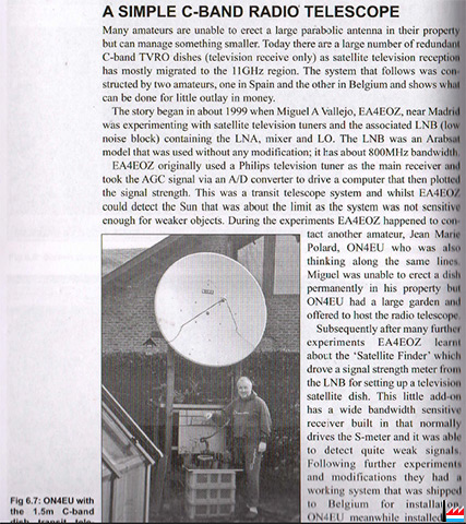 En fait le LNB mesure le bruit de fond et lorsqu'une étoile passe devant et qu'elle produit des ondes radio, cela créée un petit signal qui est amplifié et envoyé au PC pour analyse. (Photos: Jean Marie POLARD F5VLB)