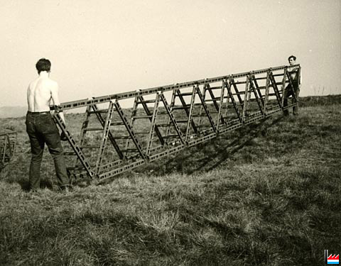 échelles pliables et transformables (en acier COROX, provenant des laminoirs d'ARBED-Dudelange) et en aluminum (alliage breveté par Aluminum LUX et produit par un laminoir italien) invention de M. Capgras |