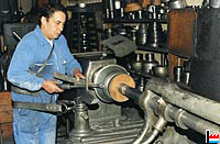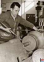Metalldrücker an der Leifeld - Drückbank (für 100-500 zu produzierende Einheiten) Um beim Führen des Drückstocks über mehr Kraft zu verfügen, stemmt der Metalldrücker sich mit seinem Körper gegen einen Lederriemen. Diese Maschine stammt aus der Gründerzeit der Fabrik. |