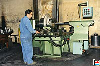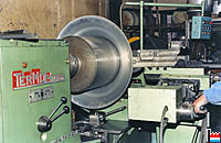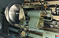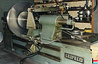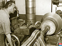 Bei größeren Hohlkörpern reicht die menschlicher Kraft nicht mehr aus. Bei der Herstellung von Hohlkörpern von einem Durchmesser von 30 - 50 cm (zB 100 l Töpfe) führen mechanisch geführte Druckrollen die Arbeit an der Leifeld - Planierbank aus. Diese Maschine stammt aus der Gründerzeit der Fabrik. |