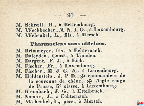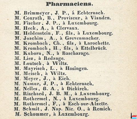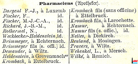 | 1867 | Pharmaciens. M. Brimmeyer, J. P., à Echternach. Pharmaciens sans officines. M. Brimmeyer, fils, à Echternach. Source: Almanach pour l’an de grâce 1867, de l’ère grégorienne à l’usage des habitants du Grand-Duché de Luxembourg, 101me année, Luxembourg. - Imprimerie de Pierre Brück, éditeur, 1867, 178 pages (Collection famille Aschman-Bodson) |