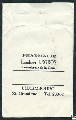 Pharmacie Lambert LEGROS - Luxembourg, 52, Grand'rue - Sachet en papier à entête - 8 x 5 cm. - Collection Ph. Aschman