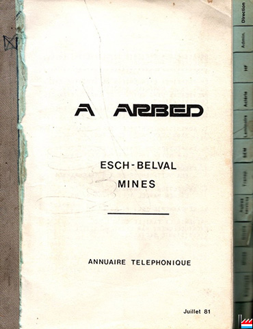 | 1952 | ![]() Nomenclature des abonnés aux réseaux téléphoniques des Usines ARBED et de la Cimenterie d'Esch (1952; Collection: Marcel Schlim) Telefonbuch 1952 mit den Werken AES - AEB - TERRE-ROUGE - MINES - CIMENTERIE und (ADU nur Telefonzentrale - Nummer) |