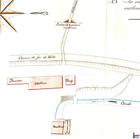 Bureau - Ateliers - Forge - Turbine - Canal - Entrée de la galerie principale (Document: ANLux IM I 48/341)