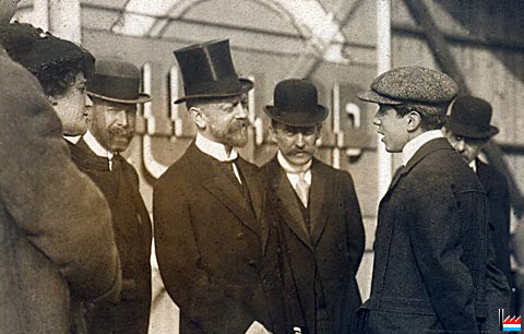 | 16.9.1908 | ![]() Ernest Zens (à gauche, comme passager) et Wilbur Wright (à droite, comme pilote) sur biplan au Camp d'Auvours à Le Mans - 16.9.1908 (Carte postale: Marque ROSE, Paris, 145 rue du Temple; Collection: industrie.lu) |