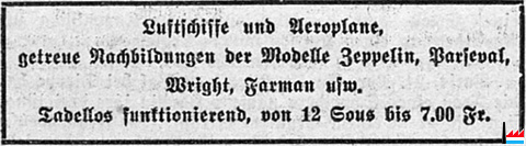 | 11.1909 | ![]() Luftschiffe und Aeroplane, getreue Nachbildungen der Modelle Zeppelin, Parseval, Wright, Farman, usw. Warenhaus M. Knopf Luxemburg (LW: 24.11.1909) |