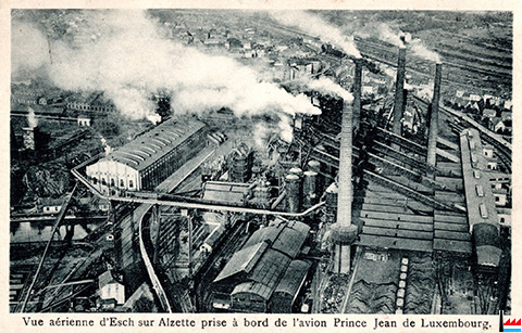 Usine Terre Rouge, Esch/Alzette - vue aérienne prise à bord de l'avion Prince Jean de Luxembourg - 193x (Carte postale: Aviat. L. Hemmer - Photo et Phototypie Schaar & Dathe A.G. Trier, Luxembourg; Collection: Marcel Schlim)