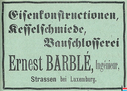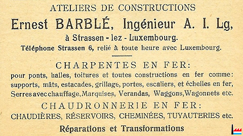 | 1904 | ![]() Ernest Barblé, ingénieur, Strassen - Publicité - Luxemburger Handels-Adressbuch 1904 (Collection Philippe Aschman) Eisenkonstructionen, Kesselschmiede, Bauschlosserei |