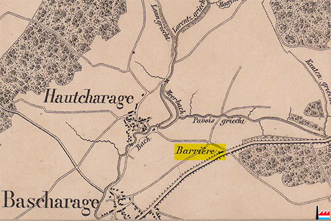 ![]() Barrière tëschend Heischent (Heiderscheid) an Heischtergronn (Heiderscheidergrund) - = Brusselhof ? (Carte Jean-Baptiste Liesch - 1862) |