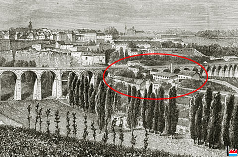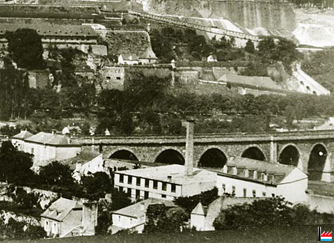 Usine au Plateau Altmünster vers 1909, en bas des bâtiments de la Brasserie Mousel (Collection: industrie.lu)