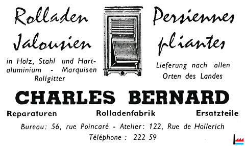| 1948/49 | Bernard Charles, fabricant de jalousies 162 route d'Esch |