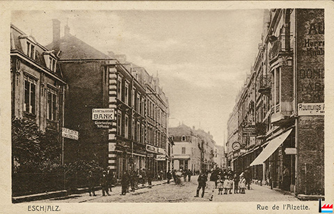 Internationale Bank (1935: BIL, 27 rue de l'Alzette) - Lederhandlung A. Peckels (1935: Peckels Albert, 29 rue de l'Alzette) - Epicerie J.P. Gerson (Maggi) <=1931 (Carte postale: Maison de gros P. Houstraas, Luxembourg & Metz Nr 33; Collection: industrie.lu)