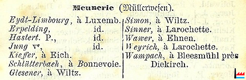 Wampach, Bleesmühl - Meunerie - Müllerwesen (Source: Almanach du Commerce du Grand-Duché de Luxembourg par N.C., 1re année, 1857, Luxembourg, Heintzé Frères, Libraires-Éditeurs; page 37; Collection: famille Aschman-Bodson)