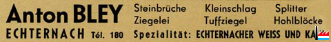 | 1948/49 | Bley Antoine Steinbrüche, Kleinschlag, Splitter, Ziegelei, Tuffziegel, Hohlblöcke Spezialität: Echternacher Weiss und Kalk |