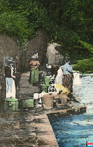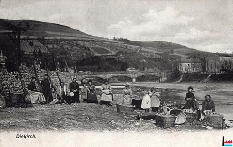 Wäschfraën un der Sauer, Dikkrëch - Waschfrauen an der Sauer, Diekirch - um 1908 (Carte postale: Edit. Th. Manon - Champagne, Diekirch; Collection: industrie.lu)