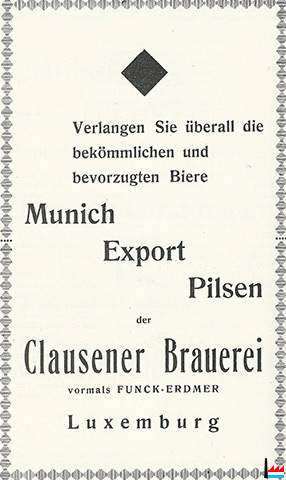 1935: Clausener Brauerei vormals Funck-Erdmer - Munich Export Pilsen (In: Jubiläumsnummer der Luxemburgischen Bienenzeitung 1885 - 1935 N° 8 u. 9)