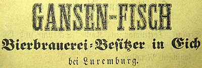 | <=1857 | ![]() Gansen - Fisch Bierbrauerei-Besitzer in Eich bei Luxemburg - 1857 (Source: Almanach du Commerce du Grand-Duché de Luxembourg par N.C., 1re année, 1857, Luxembourg, Heintzé Frères, Libraires-Éditeurs; Collection: famille Aschman-Bodson) |