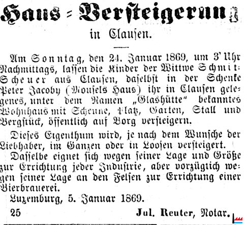 | 7. 1870 | Concession du 16 juin 1870, au sieur Petit clerc, de mettre en activité, dans la maison Staudt, à Clausen, un four construit en maçonnerie, pour servir à l'exploitation d'une touraille de malteur. (L'Union: 8.8.1870) |