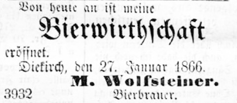 | 27.1.1866 | Von heute an ist meine Bierwirtschaft eröffnet. M. Wolfsteiner, Bierbrauer Diekirch (Der Wächter an der Sauer: 1.2.1866) |