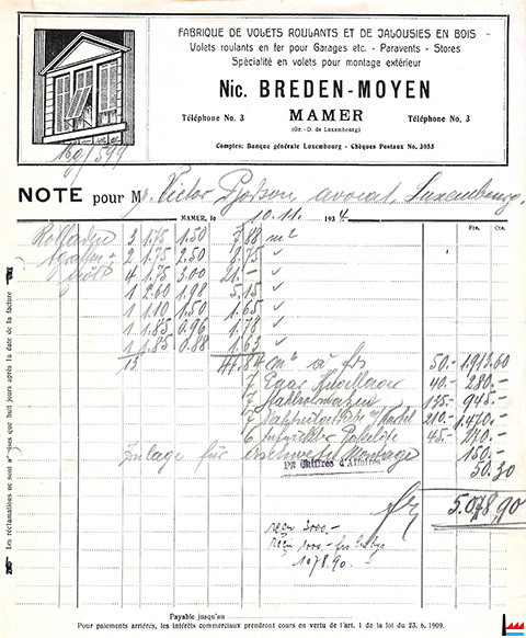 ![]() Nic. BREDEN - MOYEN, Mamer (Gr.-D. de Luxembourg) Téléphone No. 3 Fabrique de volets et de jalousies en bois Papier à lettre à en-tête (Collection Aschman-Bodson)