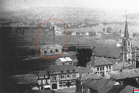 1905: Derrière la nouvelle gendarmerie récemment construite, la briqueterie hors service et la cheminée qui fut démolie lors de l'implantation de l'Aciérie et des Laminoirs (Photo collection: Albert Wolter)
