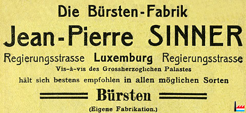 | 15.8.1906 | Jean Pierre Sinner, Bürstenfabrikant und Kaufmann, vis-à-vis dem großherzoglichen Palast, führt die Firma Sinner & Welfring, Bürstenfabrik und En-Grosgeschäft, weiter (LW: 8.9.1906) |