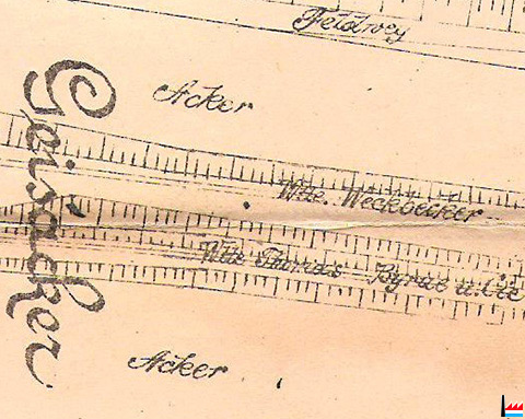 Links oben: Straße (rue des Martyrs); rechts oben: Feldweg (rue St. Joseph), Acker, Geisacker, Büreau, Witwe Weckbecker, Witwe Thomas Byrne & Cie, Carl Perlot von Rümelingen, Société des Mines d'Esch